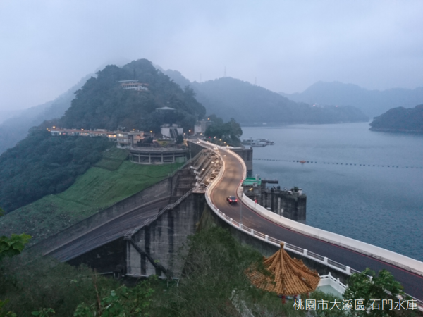 相隔四年,我們終於在夜幕降臨前抵達石門水庫大壩,天氣卻沒有上回那般晴朗,沿著壩頂行走,中間聳立的「嵩臺」是欣賞水庫的展望點,平靜水面上泛起矇矓薄霧,傍晚五點鐘,壩頂上的路燈悄悄亮起,待到天氣晴朗的時候,或許應該再到此處一回,欣賞石門水庫的夕照。