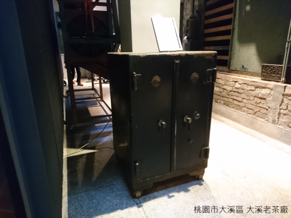 收納展示櫃中的物品,以及懸掛牆上的照片,呈現過往大溪百吉一帶風土民情,至於此地歷史沿革,或者製茶產業的衰弱與興盛,展間陳述不多,林林總總的製茶工具,茶廠卻如數家珍,大型機械之外,擺放角落的保險櫃銅製手把、鐵製外殼,三層日文密碼鎖加上一個偽裝鎖,夾層灌砂增加重量,更特別的是,內有梧桐木做成的櫥櫃從未被開啟過,所以保險櫃中到底收藏什麼寶物,現在仍然沒有人知道。