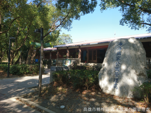 二十年來的休養生息,公園內綠樹成蔭,樹林間有時微風拂面,筆直步道盡頭,「金雞報時」日晷雕塑是公園的地標,蘊含古代中華文化「神鳥」意象,也是觀測時間、季節變化的工具,和「金雞報時」一樣奇特,卻鮮少人知道,海洋國家公園管理處就在步道兩旁的建築物中。