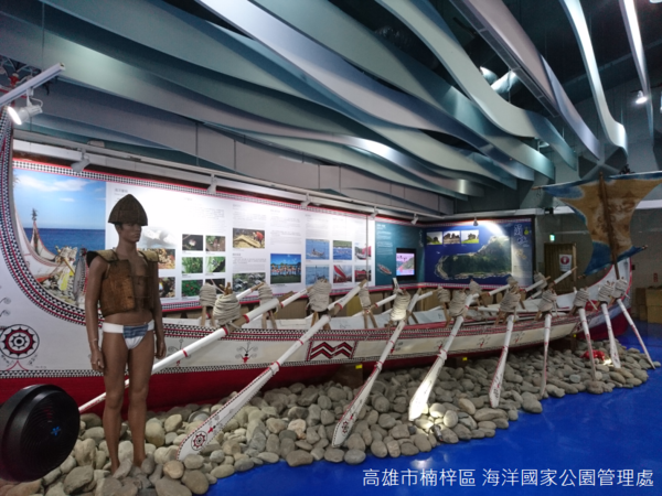 展示館內最顯眼的,是達悟族的拼板舟(tatala),旁邊一尊達悟族戰士的肖像,不過,蘭嶼推動成立國家公園多時,卻因為環境保育的規範和達悟族文化習俗相衝突而無法執行,同時,社會對海洋的了解,也像是展廳陳設一般,有著非常多的改進空間。