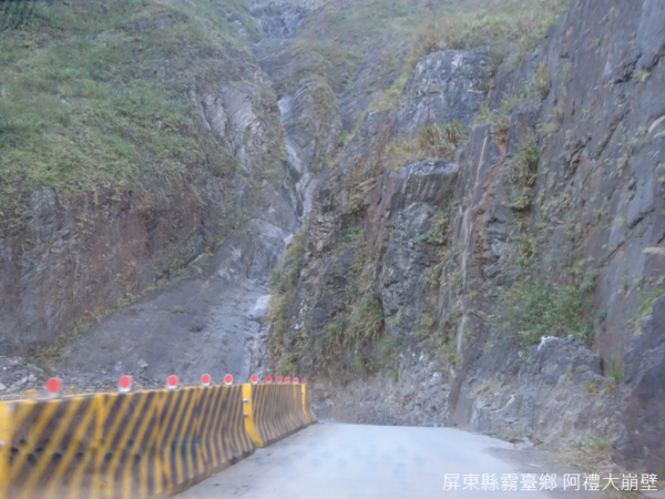 「停車再開!道路狹小注意禮讓會車。」幾乎無法容下兩車並排的窄道水泥鋪面,左側是紐澤西護欄,右側緊貼裸露山壁,從車窗抬頭仰望,山壁上遍佈巨大的層理,有些地方是碎石壘壘的山溝,這使我們不禁繃緊神經,此時,見到當地村民身穿螢光背心,站在道路中途指揮交通,示意我們緩慢前行,心裡又篤定、安穩了一些。