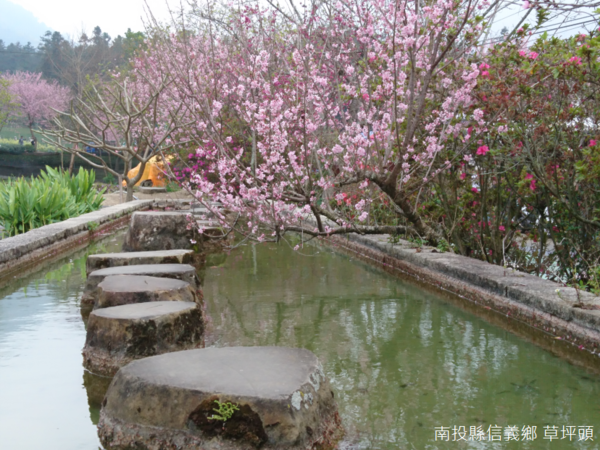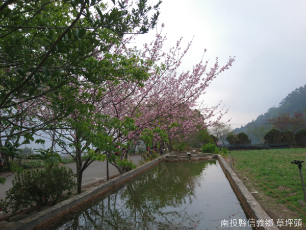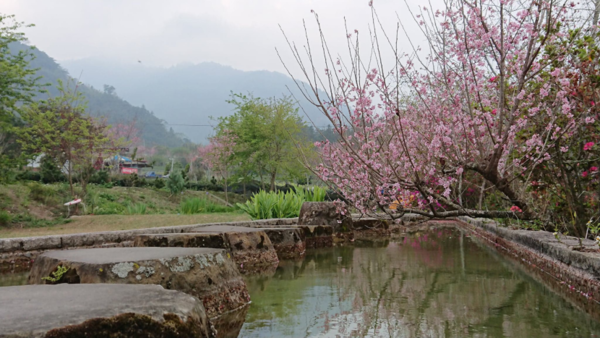 與眾不同的地方,新玉峰製茶所附近排列的大水池,粉紅花霧點點漫延投射倒影,倒影裡綠樹叢叢,粉白底色中水波盪漾,池上還有巨石羅列,這和武陵農場雪山登山口的大水池有著異曲同工之妙,本來都是茶園的灌溉水源,如果雪山登山口大水池收藏的是天空中無數繁星,我想,眼前鏡面收藏的,應該就是春天裡櫻花剎那間的美麗。
