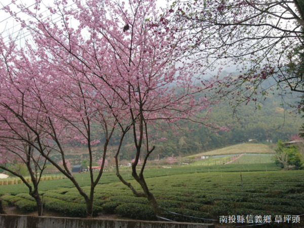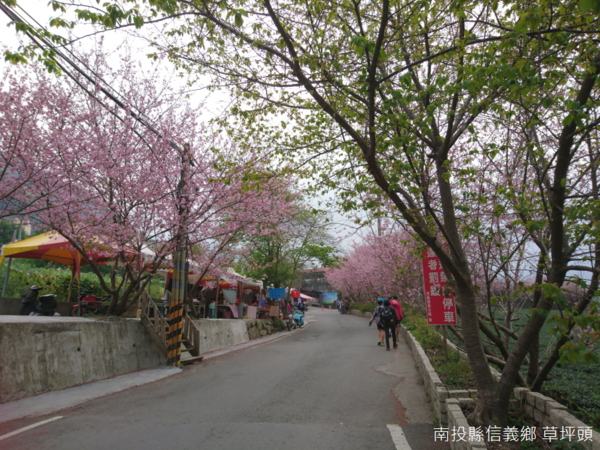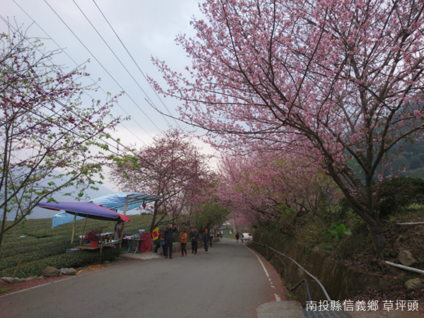 草坪頭橋另一端的農夫市集,櫻花花況此時漸入佳境,除了主軸--草坪頭林道以外,原本運送農作物的小徑,分別被命名為「景觀步道」、「遊園步道」、「桃花步道」、「賞螢步道」以及「登山步道」,如果賞櫻意猶未盡,還有李花、杏花、桃花等等可以觀賞,然而,大多數人仍然喜歡駐足在櫻花樹下,以茶園當作背景,有時自拍,有時合照留念。