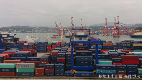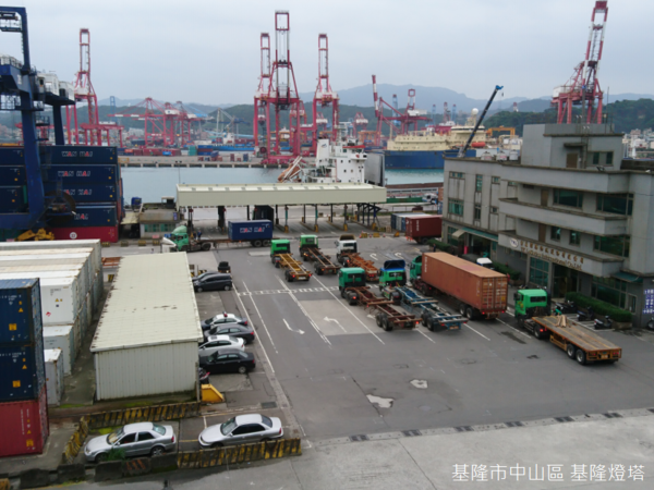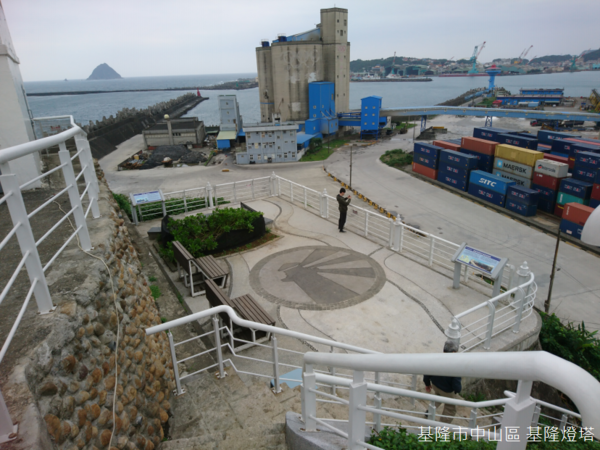 根據解說牌的介紹,基隆港共有56座碼頭,其中貨櫃碼頭15座,散雜貨碼頭21座,客貨運碼頭2座,油類碼頭2座,以及公務碼頭16座,散雜貨碼頭平均年裝卸量約8,472萬噸,貨物類別包括礦石、水泥、汽車及其他雜貨,而燈塔下方為基隆港西岸的散雜貨碼頭區及物流倉儲區,隔著水道右手邊為西岸北機場,左手方向更遠處則是台船基隆造船廠。