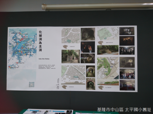 「化被洞為主洞」由臺大城鄉所設計,從東岸到西岸,基隆市區周圍淺山為了軍事需要,開鑿出錯綜複雜的防空洞,保障全市數十萬人的安全,如今反而變成治安死角,所以作品希望善用窳陋空間,找洞、找人、找故事,將縱橫城市地下的網絡重新召喚起來。