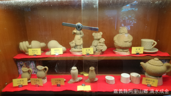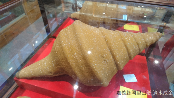 「滴水成金」是豐山村的特產,由於當地含有碳酸鈣的地底伏流,泉水沿著岩石縫隙不斷滲出,遇到樹根或是樹枝即會沉澱結晶,形成柱狀或樹枝狀的「石灰華」,外觀彷彿鍍金一般,於是當地有人靈機一動,將器皿放置水下低潤一到兩年,讓晶體附著在器皿表面,最後製成「滴水成金」;村內展售中心作品琳瑯滿目,茶壺、海螺、布偶都是創作的題材,製作時間漫長的緣故,作品樣樣價值不斐。