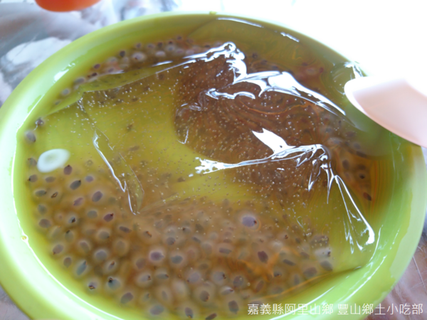 愛玉冰外貌並不起眼,齒頰之間卻有著其他地方沒有的絲滑口感,這時候,弟弟迫不及待地將百香果糖膏和黑糖膏一一加入,他說,糖膏口味濃厚,卻和愛玉沒有違和,一開始我只留戀愛玉清淡的甜味,最後才決定摻入糖膏,這才發現愛玉和糖膏彼此激盪的滋味果然可口;滴水成金本來潛伏於山泉,而愛玉原本生息於山林,卻因為阿里山的靈氣而不平凡。