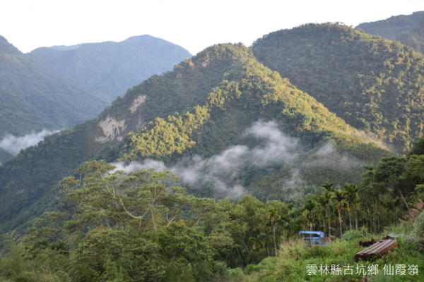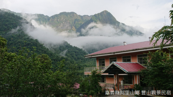 「豐山觀景民宿」前的展望臺,石鼓盤壯麗景緻一覽無遺,乾坑溪、石鼓盤溪和蛟龍溪三溪匯流的村莊周圍,從左到右,分別是土石流紀念公園上方的牛鞍山,遠處南投、雲林和嘉義三縣交界,最後石鼓盤溪左岸的獅頭鼻,獅頭鼻背後的峭壁,懸掛的是天雲谷瀑布細長白絹。