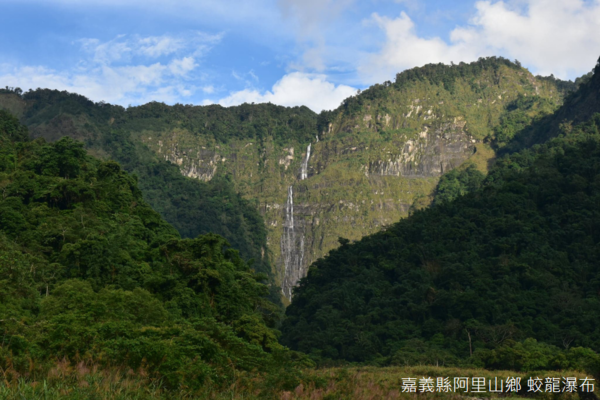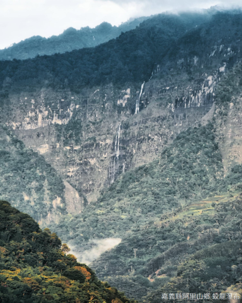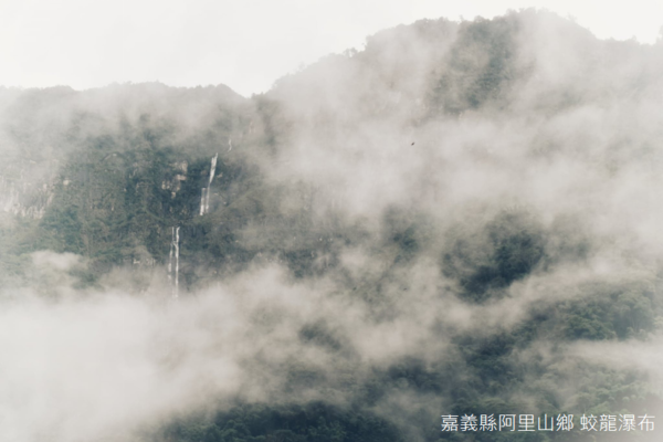 每年五至九月的雨季,瀑布挾帶豐沛水量,彷彿飛天巨龍自阿里山山脈的稜線奔湧飛瀉,雷霆萬鈞,氣勢磅礡,據說甚至會在瀑布下的深潭激起滔天巨浪,旱季時,瀑水則會流入峭壁石縫中,再由底端冒出匯入蛟龍溪,多數的時間,瀑步垂掛於山壁,層層疊疊細且綿長的線條,襯托出阿里山山脈的陡峻,以及聖觀音峰的雄奇。
