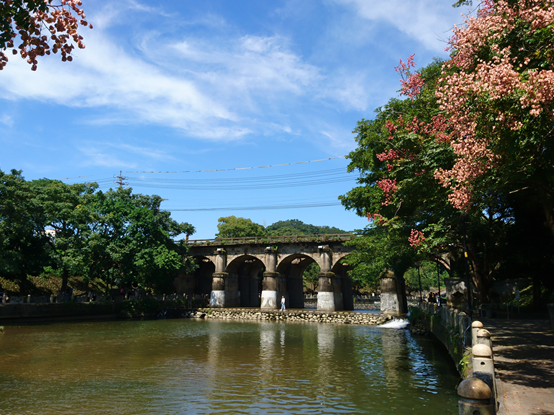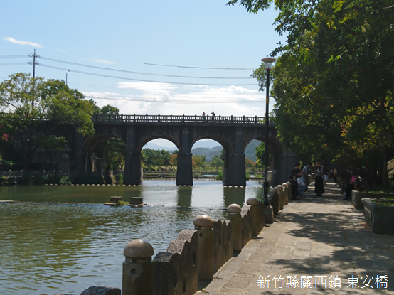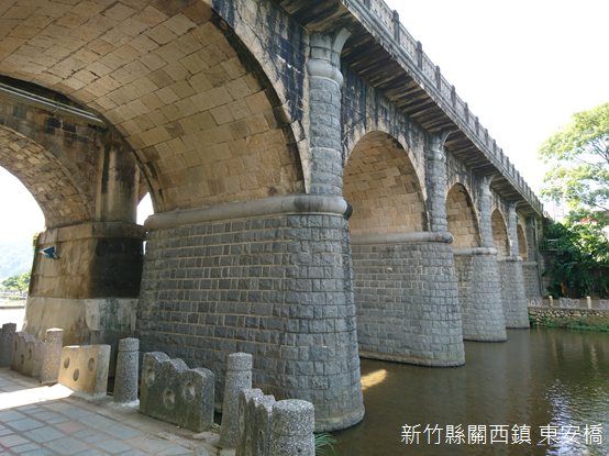 正當我們走到欒樹花開最濃烈的地方,不知不覺同時到達東安古橋下。為了聯絡市區和東安一帶的人家,當地人起初搭建一座木造便橋,卻總是被山洪所沖毀,有鑑於此,昭和八年(1933)官民共同出資,聘請日本技師設計,交由本地石匠李鎮帶隊修築,費時11個月竣工,昭和10年(1935)8月通車。後來交通日益繁忙,民國92年(2003)在舊有五拱橋旁擴建新橋,有趣的是,考量到防洪的緣故,舊橋橋柱外圍包覆水泥,反而使仿古的新橋比較像舊橋。民國99年(2010),東安古橋被列為縣定古蹟。