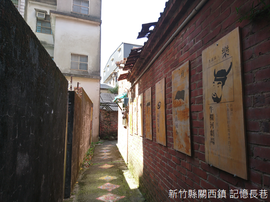 順著長巷向前探索,有些角落擺放植栽,一面牆懸掛著酒瓶,另一面牆則懸掛著看板,彩繪上關西的食衣住行育樂,最後巷子通抵接近河岸的道路,不過卻沒有銜接河岸,「就差一點點距離了。」後來從河畔折回老街時,我才突然了解長巷的作用。