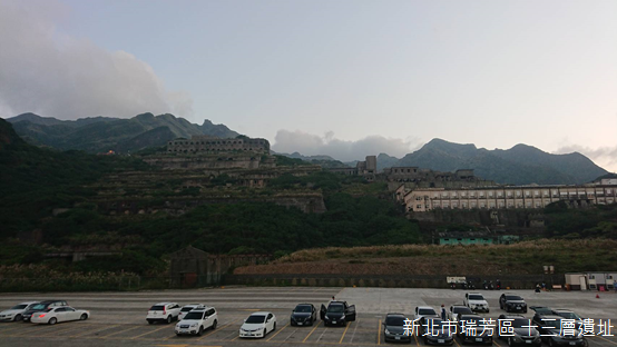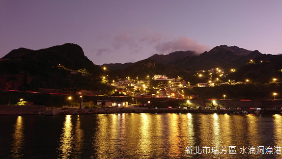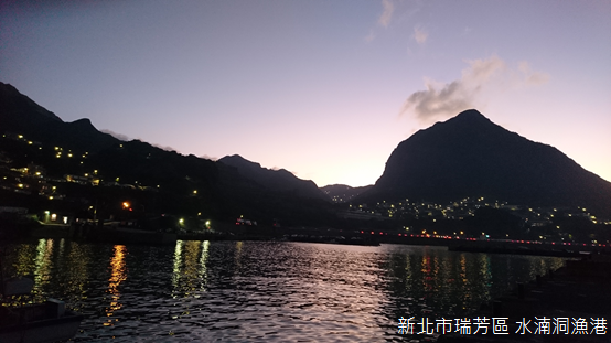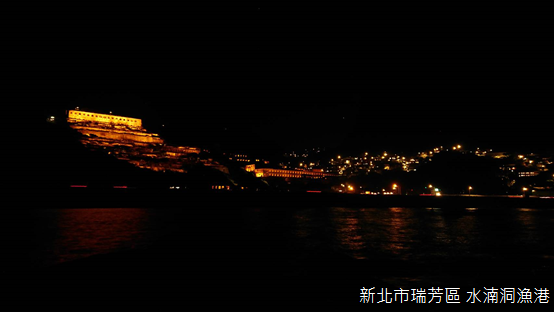 對我們而言,水湳洞漁港是拍攝十三層遺址光雕最理想的地點,不但能夠看見完整而無遮蔽的建築,水面投射出的倒影,更是其他攝影地點無法捕捉的景象。傍晚,許多人已經在堤防上守候,我們則是經過水湳洞安檢所,走到漁港另一端的堤防上。黑夜來臨之前,天際線只剩下基隆山與金瓜石背後羅列群山的剪影,水中的燈火隨著時間推移越顯得明亮。