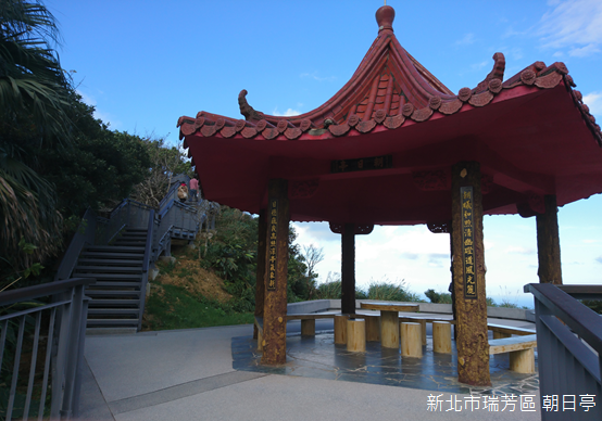 勸濟堂附近的報時山步道,是金瓜石一帶最容易親近的步道。全長約200公尺左右,起初一段陡直的階梯到達中途的「朝日亭」,紅瓦飛簷,朝日亭面向步道的柱子上書寫「朝曦和煦清幽蹬道風光麗」與「日德巍峨高照涼亭氣象新」,由此可見,報時山步道適合欣賞日出,不過多數遊人不善於早起,對涼亭興趣不大,只是一股腦兒地朝山頂前行。