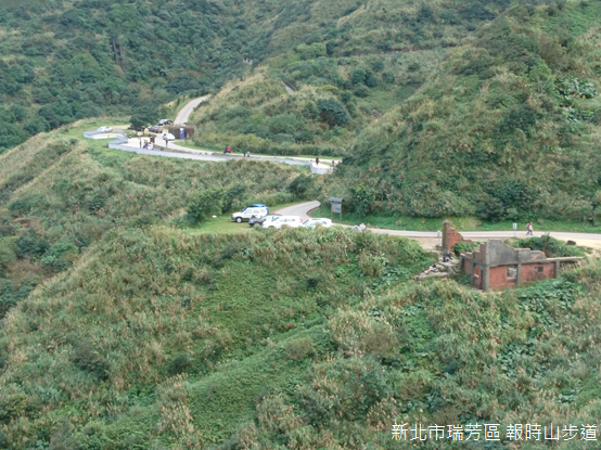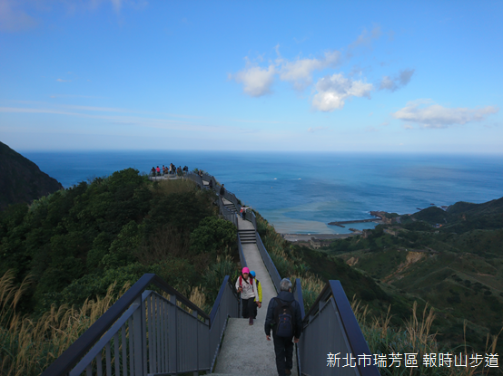 轉眼之間,山頂的觀景平台已經抵達。報時山又名「水螺山」,海拔約260公尺,據說日據時期曾經被架設警報器,作為空襲警報以及定時鳴放之用而得名。海拔高度雖然不高,山坡在此陡下海洋,報時山卻是欣賞水湳洞海岸景觀最理想的地點之一。天朗氣清的時刻,海水湛藍,水湳洞漁港旁的陰陽海一半清澈,一半黃濁,色彩對比格外鮮明,至於十三層遺址和煙管,則隱藏在翠綠草坡底下。