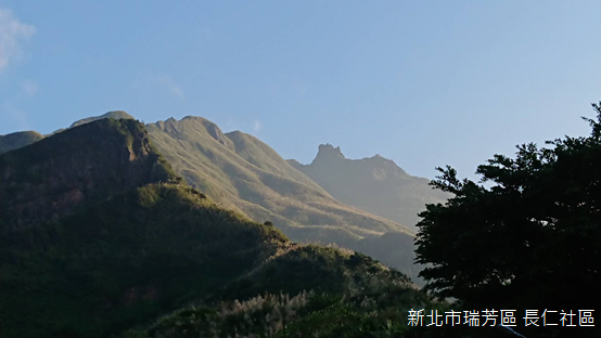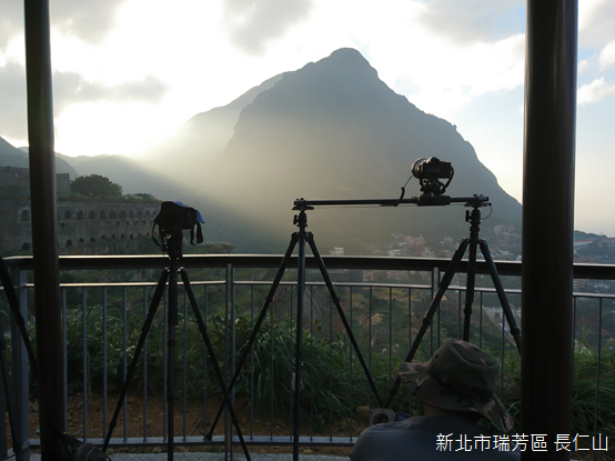 長仁山海拔121公尺,形勢和報時山類似,是小而尖聳的山崗,穿過「瑞芳區長仁社區活動中心」的樓房,川廊底下兩隻白狗趴睡著,接著從戲台旁的階梯直上,不到100階的距離即可抵達山巔的涼亭,許多攝影人早已架設相機,守候多時。
