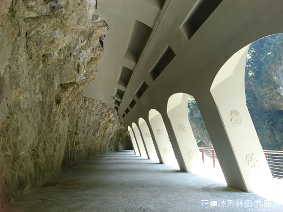 時逢正午,遊客多半在天祥或是太魯閣口享用午餐,少去人潮擁擠,我們以輕鬆愜意的步調,穿梭在九曲岩壁和明隧道之間。短短700公尺的距離,總計穿越三座景觀明隧道,採用拱型清水模工法施作,明隧道的支柱上還有金花石蒜、臺灣蘆竹等五種生長於峽谷的植物浮雕。