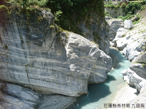 峽谷的山風與遮蔭,驅除酷暑的炎熱,見到鑿刻「觀水」的石碑,我們順著階梯走下「水景步道」。總長91公尺,同樣遭遇岩壁容易坍塌的路段,清水模工法建築的水景步道更貼近立霧溪谷,甚至可以藉著腳下的玻璃地板,感受溪水湍流的震撼。由大陸側淺海的珊瑚骨骼與部份生物的介殼所組成,石灰岩幾經變質成為大理石,其中又以太魯閣燕子口至九曲洞路段最為經典,或許是天氣晴朗的緣故,立霧溪呈現一帶乳白的青色,溪流兩岸的大理石岩層分外明晰。
