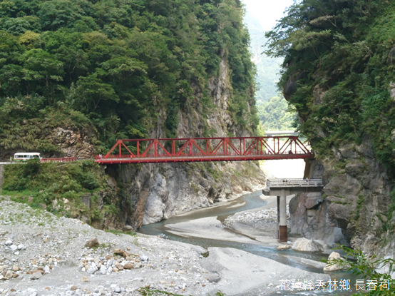跨越長春橋,進入湧現泉水的洞窟之前,上回遊覽時不免心生疑惑:為什麼鮮紅色鋼橋底下,另有一座看似未完成的混凝土引橋?原來,那是中橫初建時,取代舊有仙寰吊橋的第一代長春橋,民國47年(1958)竣工不久就被溫妮颱風引發的洪水摧毀,於是才有當今位置較高的第二代長春橋。