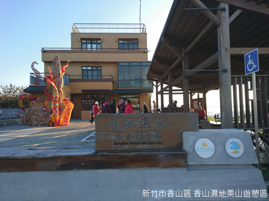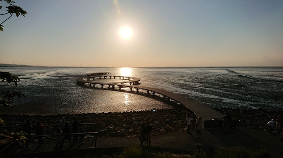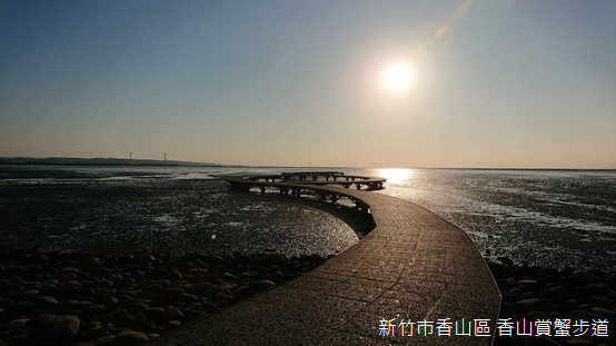 因為香山濕地生態展示館的介紹,我才曉得冬季只見水鳥,見不到棲息在潮間帶的螃蟹,東北季風時常冷冽,這也是賞蟹步道封閉的原因;儘管如此,遊人仍舊聚集在海濱,目送逐漸西沉的斜陽。此時此刻,山和海和天和落日一齊屏住的,渾然的時辰,渾然不覺,造化大球正向東翻滾。