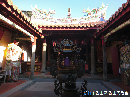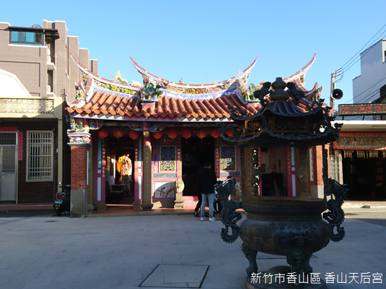 與車站相隔幾條巷弄,濱臨海岸的香山天后宮更見證清代香山港的盛衰。主祀天上聖母,根據文獻記載,香山天后宮最晚於清道光五年(1825)建成,日據初期,天后宮一度成為香山警察分署,直到大正11年(1922)重修,大致上呈現出今日樣貌。天后宮建築格局為二進二迴廊,面開三間,內殿有一座石香爐,香爐兩側雕塑獅頭,造型獨樹一格,民國93年(2004)公告為歷史建築。