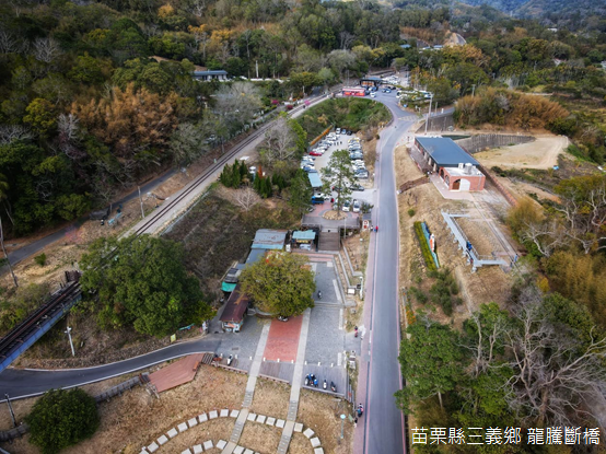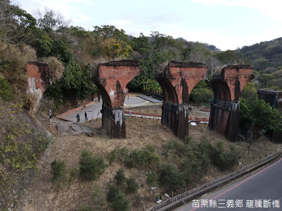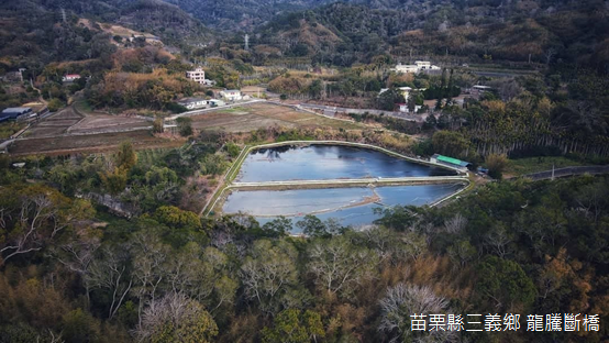 隨著空拍機緩緩升起,視窗中龍騰斷橋周遭的景物一目了然,將近百年前震毀的磚砌鐵路橋,餘下的四根橋柱聳立在魚藤溪右岸,西側舊山線鋼構橋樑依然健在,橋上不時可見鐵道自行車來回穿梭;此時此刻,附近停車場的車輛,以及遊客中心的房舍都變得小小的,距離龍騰斷橋不遠處的樹林裡,竟然隱藏一座飼養大閘蟹的池塘。