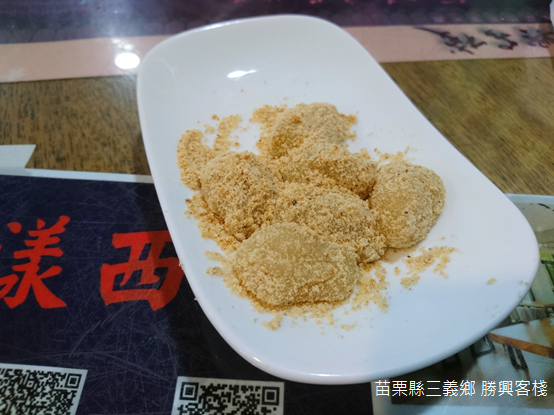 「勝興客棧」是附有閣樓的一層樓磚造平房,屋外懸掛一串紅燈籠,路旁的廚房則是木板搭建,或許正是兩旁透天厝尚未改建之前原有的模樣。除了房舍造型樸拙,餐廳內擺設圓桌和鐵凳,也彷彿像是逢年過節,和伯伯和姑姑幾家人團聚吃飯的情景。閱覽竹節製作的菜單之後,店員端上一盤沾上花生粉的麻糬當作開胃菜。