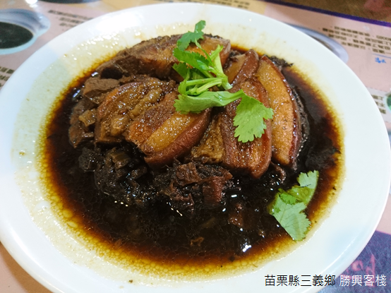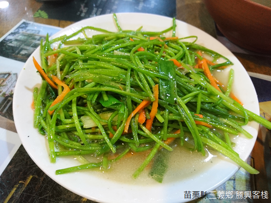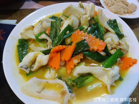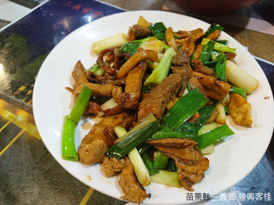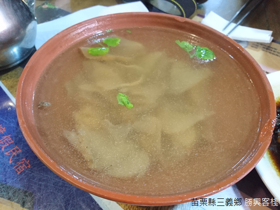 客家菜往常帶給人們重油、重鹹的印象,尤其觀光景點的餐館更時常無法令人期待;然而,客棧裡所有的菜餚顛覆我們對客家菜的成見:梅干扣肉肥而不膩,炒水蓮口感清脆,桔醬花枝滋味酸甜且帶有咬勁,客家小炒以豆干和魷魚以及五花肉切絲,佐以大把青蔥,料理層次豐富多變,最後品嚐福菜湯溫暖脾胃。用餐的同時,廚房不時傳來爆炒的香氣,隔壁桌的孩童則坐在桌前製作擂茶,木棒在擂茶碗中旋轉研磨,桌前笑聲不絕於耳。