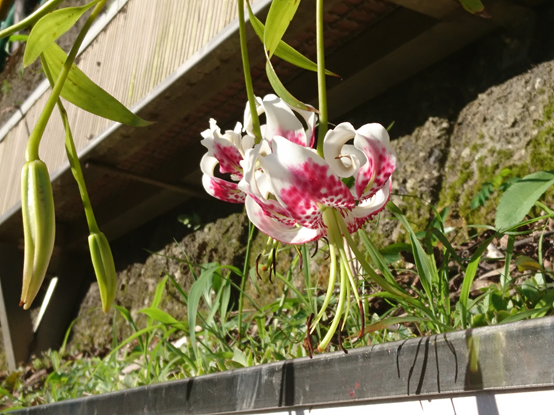 夏季是豔紅鹿子百合的花期,寺廟裡的人員見到我們一行人走來,熱情地招呼我們,直說下方院子花槽裡的百合更紅更豔。不只豔紅鹿子百合,寺廟前院的階梯上也種植金花石蒜,同屬石蒜科,是豔紅鹿子百合的遠親,耀眼的金黃花朵使山景倍加燦爛。
