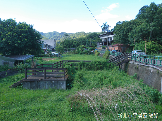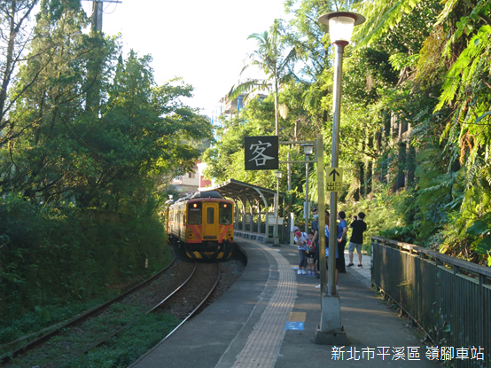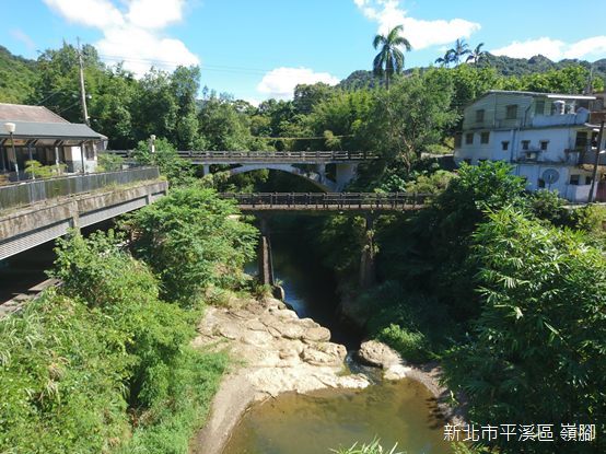 除了十分、平溪,以及菁桐,平溪線鐵路沿線散佈大大小小的聚落,而且大多別具特色,嶺腳正是這樣的地方。從石碇順著市道106號行駛,經過平溪市區後不久,出現「嶺腳車站」和「靈巖寺」的路標,轉入公路左側的小徑,跨越基隆河,即可望見河畔的嶺腳車站。清乾隆年間,興化(今福建省莆田市)人林國華拓墾此地,由於位在姜子寮山下,得名「嶺腳」。