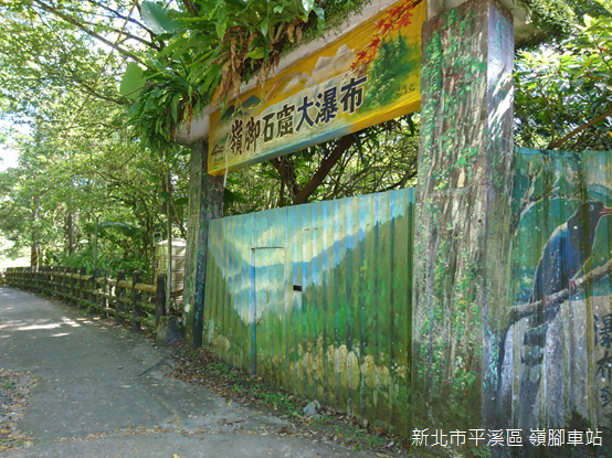 沿著鐵道行走,途經月台和煤礦卸煤場以後,隨即望見標示「嶺腳石窟大瀑布」的大門,由於溺水事件頻傳,早先在此經營的遊樂園宣告停業,距離深鎖的大門不遠,一道石階同樣可以到達嶺腳瀑布;階梯陡直,兩旁是茂密的樹林和竹林,轉眼間到達溪畔,來到嶺腳瀑布跟前。