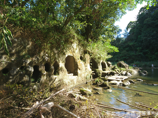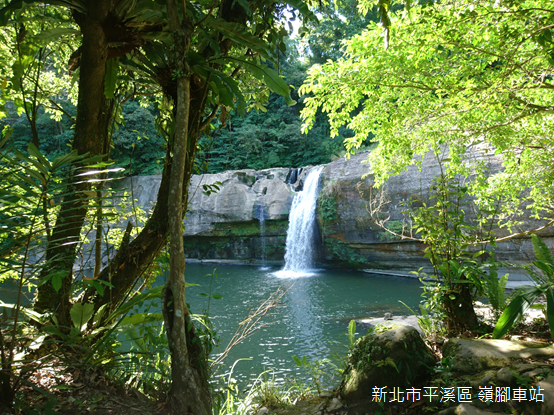 嶺腳瀑布寬40公尺,高11公尺,是平溪第二大瀑布。瀑布對面的山壁上,排列的石窟是早年一位榮民的傑作,他運用原有石洞開鑿出大小不一的石窟,洞窟裡更有連接到溪畔的階梯,有些甚至提供打坐、冥想的空間,洞內所見,水面波光粼粼,別有禪意;不過,欣賞瀑布最適合的角度當屬石窟上的高台,一縷白絹墜入一泓清池,周圍綠意環繞,靜謐的山林因為潺潺水聲,洗滌出一派豐沛的靈氣。