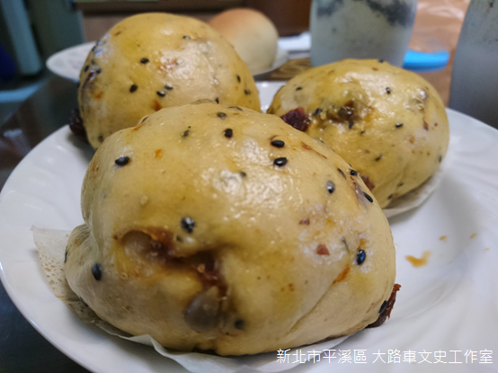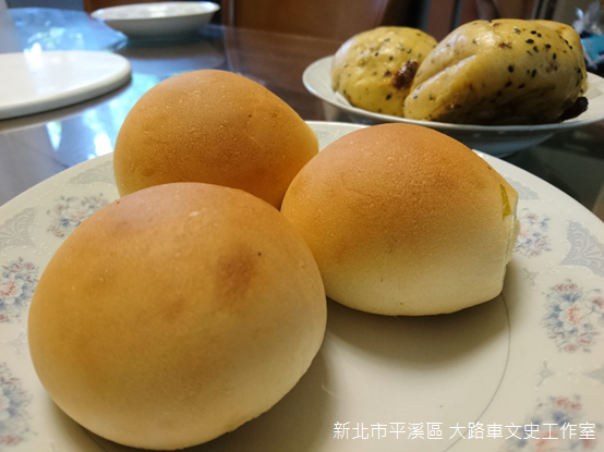 嶺腳車站隔壁,「大路車文史工作室」門口張貼平溪區地圖及台灣好行木柵平溪線的班次表,店裡不時傳來陣陣濃郁的香氣。原有店舖正值整修,工作室臨時搬遷至雜貨店的後方,走進店內,老闆蔡金木正坐在烤箱前,見到我們親切地打招呼:「這些是最近正在研發的北海道牛奶吐司,都是真材實料。」他語帶自信地說。五穀雜糧饅頭和胡椒餅是今天僅有的產品,就像老闆所說的,兩者皆真材實料,饅頭紮實綿密,胡椒餅外酥內潤,口感樸實卻回味無窮。