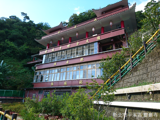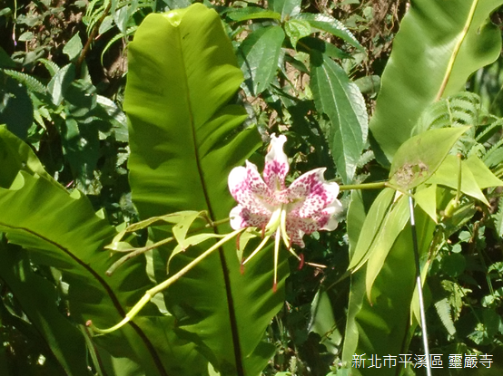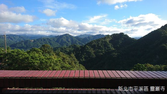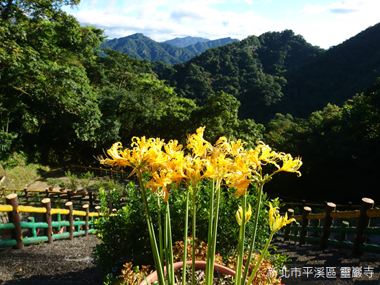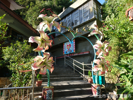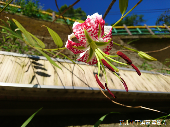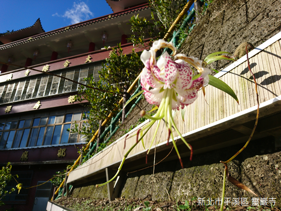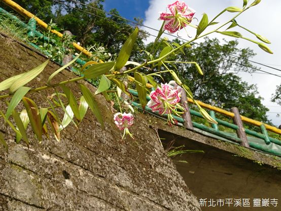 登上寺廟,山外景緻一覽無遺,背後倚靠姜子寮山,廟前兩側山稜朝向河谷傾斜;基隆河對岸的遠方,狀似金字塔的平溪中央尖海拔568公尺,與海拔550公尺的峰頭尖東峰峰峰相連,兩山的後頭,山形較為圓潤的獅公髻尾山海拔839公尺,聳立在平溪和坪林的交界上。我們在無雨的晴天一探深山裡豔麗的精靈,願豔紅鹿子百合常駐滴水觀音護佑的芬芳淨土。