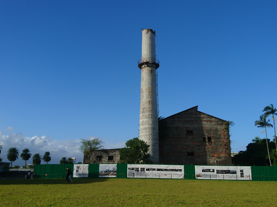 中興文創園區裡的倉庫櫛比鱗次,而高約38.6公尺的大煙囪更是園區的地標,建於昭和12年(1937),人字型屋頂的鍋爐間生產蒸氣供應其他建物內造紙設備所需的動力,燃燒出的廢氣藉由風扇輸送網煙囪排放;昭和20年(1945),美軍B29轟炸機空襲,紙廠遭受重創,大煙囪也被炸毀僅存半截,經歷七十幾年蘭雨的洗禮,竟然依舊屹立不搖。