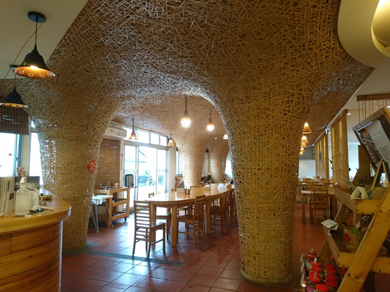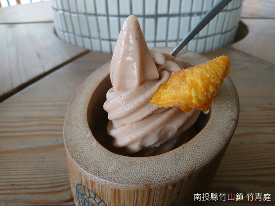 除此之外,一樓的「臺西冰果室」是客運站的候車亭,原有售票櫃檯轉變為販賣部,座位區的木製座椅圍繞拼貼馬賽克的水泥柱。一個星期有七天,每天都提供不同風味的霜淇淋,像是「紅玉紅茶」以紅茶作為霜淇淋的主要原料,撒上點點米香,再加上番薯片裝飾,最特別的地方在於,所有的霜淇淋都盛裝在竹筒裡,不僅環保,更顯現竹山在地特色。