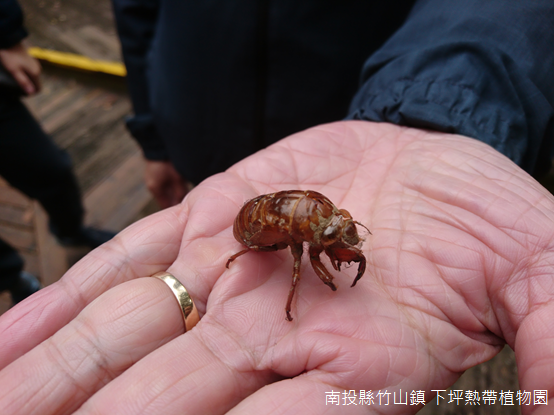 當我在巨傘下歇息時,父親在附近的樹林間發現一隻形體完整的蟬殼,「樹林裡還有很多呢!」放在手心上,他開心地對我說,堂哥祐笙見狀,從步道旁的資源回收桶內取出一個乾淨的紙杯,將蟬殼裝進杯裡;不久,我們又在鄰近的樹幹上發現許多蟬殼,陣陣蟬鳴聲中,才發現枝葉上也可以找到不少。