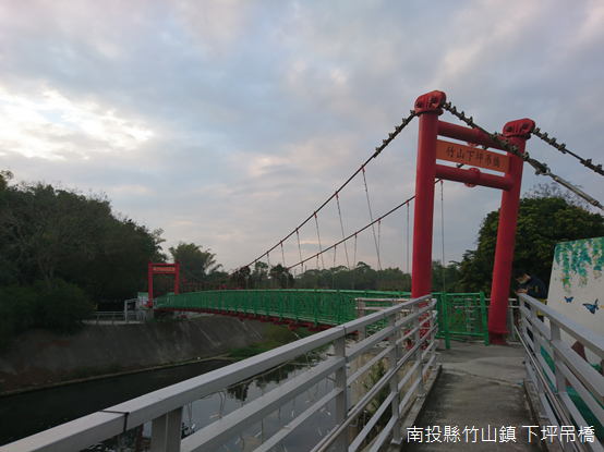 距離下坪熱帶植物園相近,下坪吊橋約建於半世紀前,早期是臺電公司提供工人維護電塔的通道,後來也提供當地農民使用,民國106年(2017)6月1日毀於洪水,歷經兩年重建完成,長約46公尺,寬約1公尺,河畔除了花海,也可以見到垂枝女貞,以及果實貌似龍眼的桐樹。