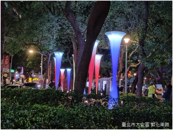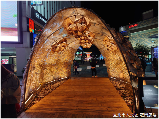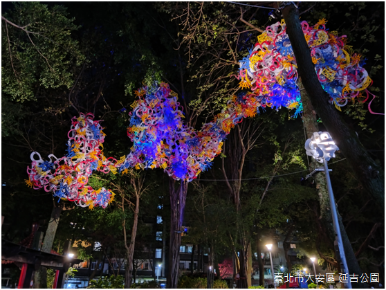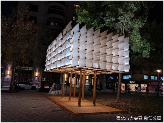 棲身於龍門廣場,〈巢詠〉是排灣族藝術家峇岦嵐偲.旮札涅灆(PaqeRiras Kazangiljan)的作品,透過排灣族語彙展現臺北海納百川的城市性格。〈仁愛帆城〉隱居在仁愛路四段71巷中的敦仁公園,工藝家范承宗表示,敦仁公園周圍街廓在一九七○年代是建築師們設計的競技場,住宅大廈深受包浩斯(Bauhaus)與現代主義的影響;有鑑於此,以船帆意象表現都市裡水平和垂直線條組成的建築,相對於其他花燈的光彩奪目,〈仁愛帆城〉樸素典雅,人們可以駐足遠望,或是穿梭其間,登上船、揚起帆,啟程,或者回家。
