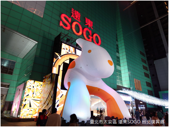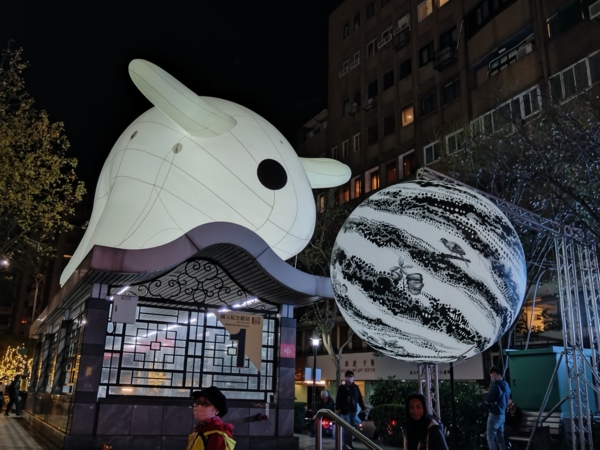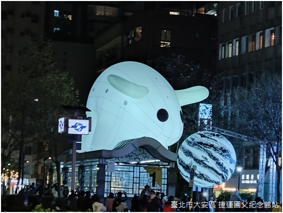 回到捷運國父紀念館站,終於在一號出口遇見光展區最具代表性的作品──〈光兔現蹤〉。現年57歲的當代藝術家大岩奧斯卡爾(Oiwa Oscar)出生於巴西聖保羅,是第二代日裔巴西人,至於〈光兔現蹤〉的發想,源於一次巴黎的旅程中,大岩奧斯卡爾望見傍晚的戴高樂機場跑道上湧現數百隻野兔,躍動的身影在暮色中閃爍著光亮,這般奇異的機緣造就「光兔」角色的問世;正逢華人農曆兔年,大衛奧斯卡於是創作〈光兔現蹤〉,藉由光兔仰望地球的視角,傳達臺北作為地球村的一份子,既充滿國際性,更洋溢現代性的光彩。