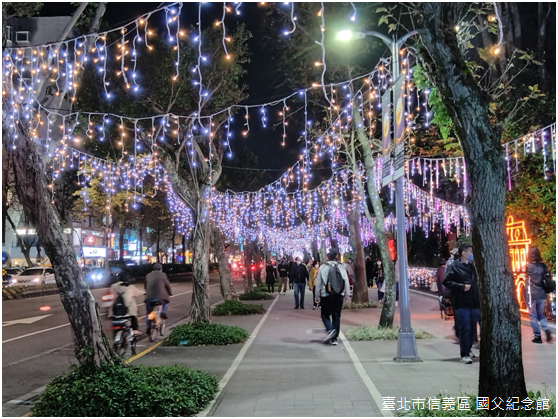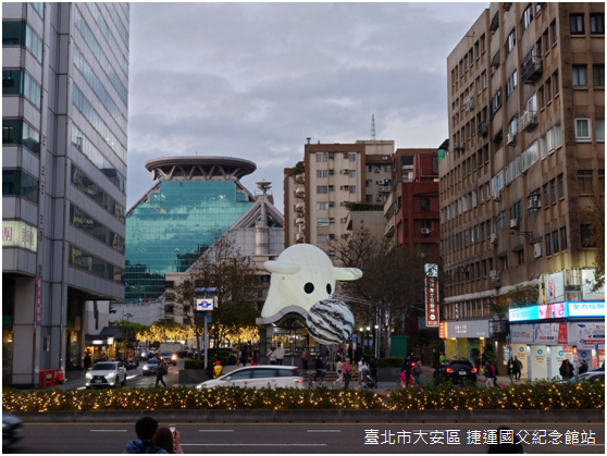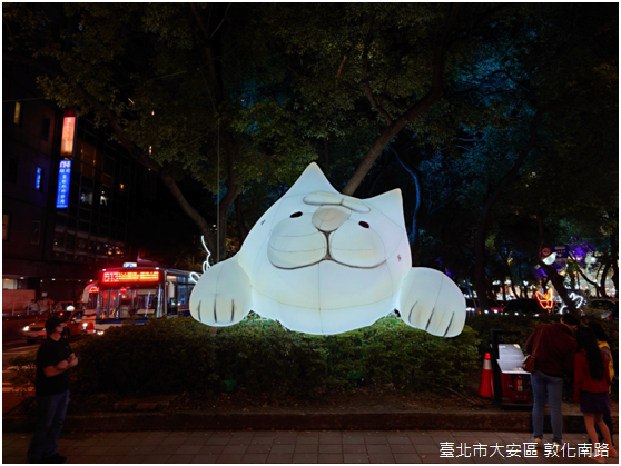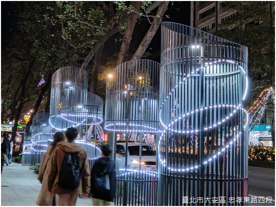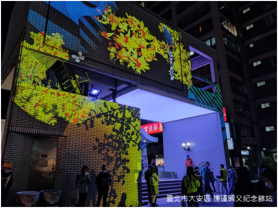 晚上八點,忠孝東路和光復南路交叉路口的賞燈人潮早已擠得水洩不通,附近捷運國父紀念館站二號出口座落在舊時三張犁支線鐵路的路線上,〈安安〉的創作者陳怡潔將燈光投影在出口的壁面,與周遭餐酒館林立的五光十色相呼應;有趣的是,臺灣欒樹、杜鵑、伯勞鳥、臺灣藍鵲等臺北盆地常見野生動物都是投影的主要圖騰,又呈現出臺北自然與人文交融的特質。