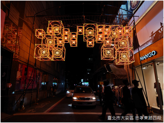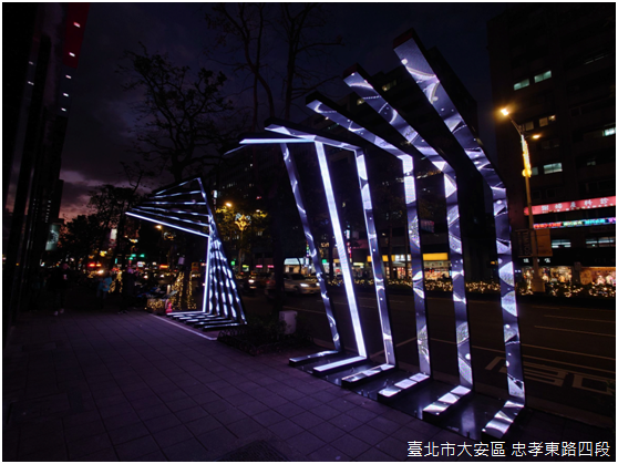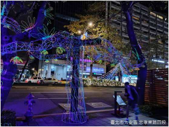 從「光源台北」主題字面上來看,「光展區」可說是今年台灣燈會的起點,更是這次燈會腹地最廣闊的展區:以捷運忠孝復興站當作起點,順著忠孝東路四段向東延伸至捷運國父紀念館站,涵蓋東區商圈大多數的百貨商場,加上鄰近忠孝東路四段的瑠公公園、敦仁公園,以及延吉公園。不只是燈飾,藝術創作者的設計更被賦予振興東區商圈的期待。