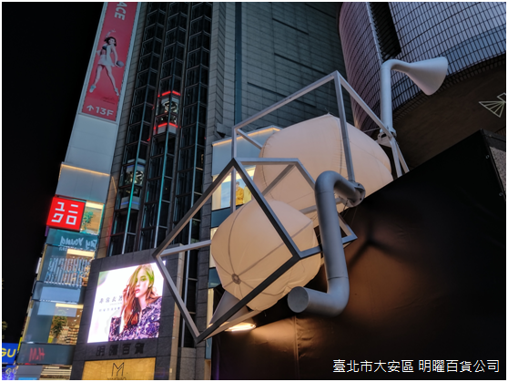 經過黑川互動媒體藝術和山影藝術實驗所共同創作的〈城市光點〉,接續遇見民國76年(1987)4月落成的明曜百貨,隱藏在明曜百貨門口右側,〈城市X程式對話〉的創作者張為雲和Tim Hong運用金屬框架結構搭建出象徵城市的外殼,安裝其中的發光球體象徵希望光源,隨著人工智慧的演進,相對於真實接觸溝通,城裡的人們似乎更沉浸於虛擬世界的社交,而當代城市又能帶給人們什麼樣的希望呢?