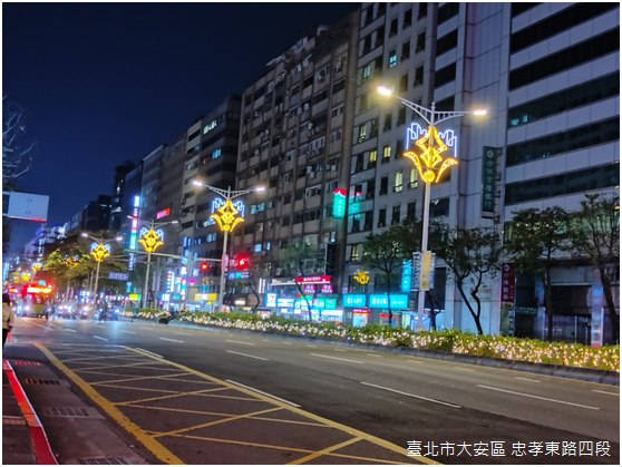 從捷運忠孝復興站改取忠孝東路四段北側的人行道折返,行經瑠公圳公園和敦化南路,〈美好時光〉出現在明曜百貨對面的人行道上,「有電互動」製作團隊運用兩輛復古單車呈現懷舊情調,樂聲中車輪緩慢旋轉,象徵時光的流動;〈光城〉外觀為並排的圓柱體,藍色霓虹代表繁華的都會,又形塑出山岳與河川的輪廓;緊接著,與〈光城〉同樣鄰近延吉街的〈北回光線〉是臺北街道路燈和招牌的縮影,看似雜亂無序的七彩釣魚線其實暗藏玄機:只要穿著白色衣物經過釣魚線下方,衣物也會投影繽紛的色彩。