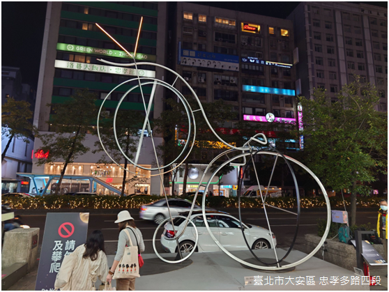 騎乘單車滑行,經過半小時左右的時間到達敦化南路,寬約70公尺的林蔭大道中央,〈城市後花園〉是藝術家蔡潔華對臺北的想像,便利的捷運網絡讓都市有如後花園一般,五種顏色的貓草分別代表臺北捷運五條軸線,臺北市民對捷運的喜愛正如貓對貓草的青睞,透過捷運,人們可以輕鬆地在都市裡尋找到一方綠地,享受大自然的美好;隔著忠孝東路相望,〈時間的瞬息〉一如海芋外觀的裝置代表度量時間的沙漏,遠離車馬喧囂,聆聽時光流動的聲響,企盼在緊張生活步調中取得片刻寧靜。