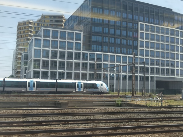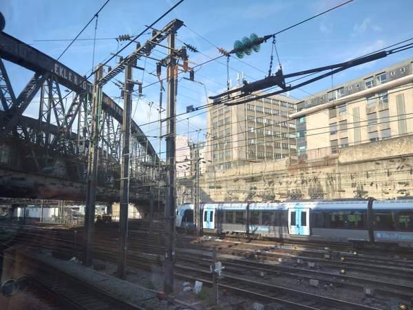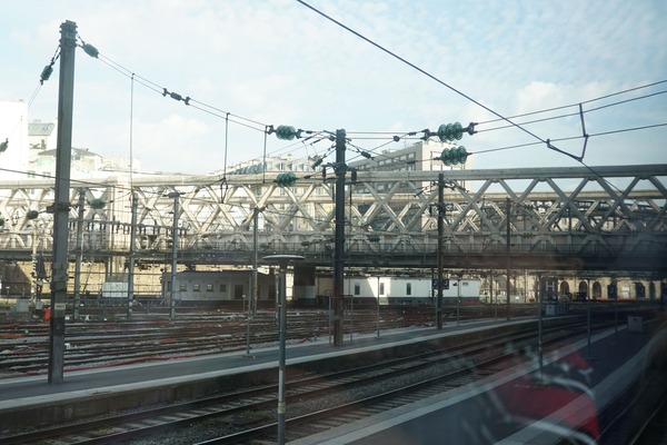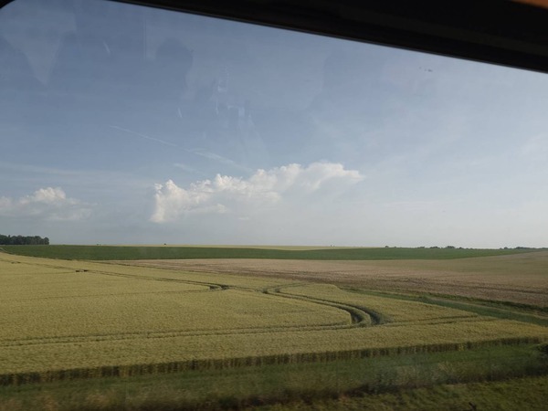 途經高藐天空底下無數的麥田與樹籬,跨越三條河川,遇見對向的列車、高速公路上往來的車輛、還有城郊的樓房,Eurostar 9338最後在14點09分抵達巴黎北站。