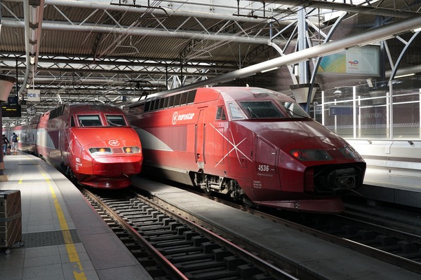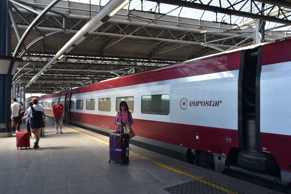 天朗氣清,惠風和暢,布魯塞爾南站月臺上停靠兩列並排的歐洲之星(Eurostar),許多旅客興高采烈如我們,在車門前等候乘車。從1994年11月開始營運,歐洲之星聯繫倫敦、巴黎、布魯塞爾、阿姆斯特丹,以及科隆等城市,最高時速可以達到每小時300公里;2022年3月,歐洲之星與大力士(Thalys)整併,車頭為流線型,車身呈酒紅色,眼前月臺上標示「Eurostar」的兩列火車,正是原有的大力士高速列車。