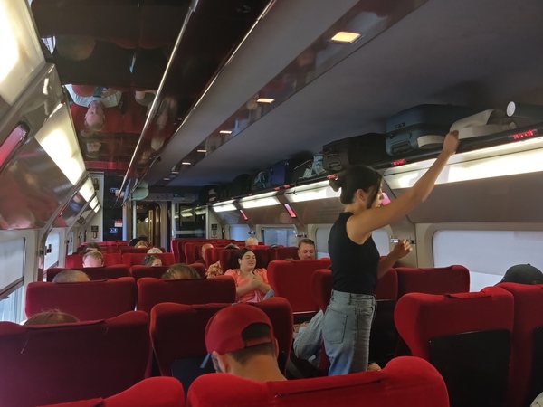 12點43分,前往巴黎北站(Gare du Nord)的Eurostar 9338正式啟程。座椅以酒紅色為基調,車廂兩端設置大型行李架,大力士更設置四人座的小包廂;透過大型景觀窗,窗外的風景一覽無遺:城郊的樓房、高速公路上往來的車輛、對向的列車、風力發電機、河川,還有樹籬,更多的時候,高藐天空底下盡是綿延起伏的麥田。