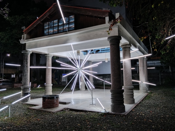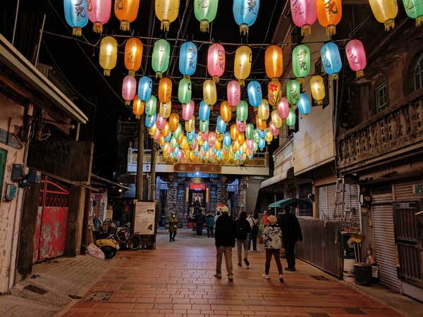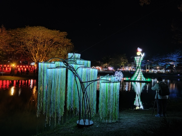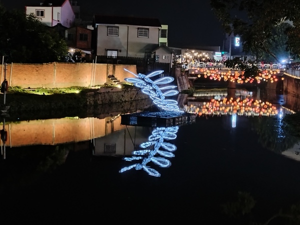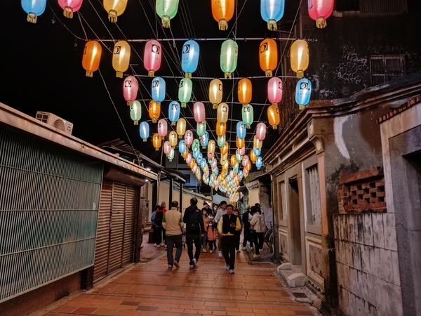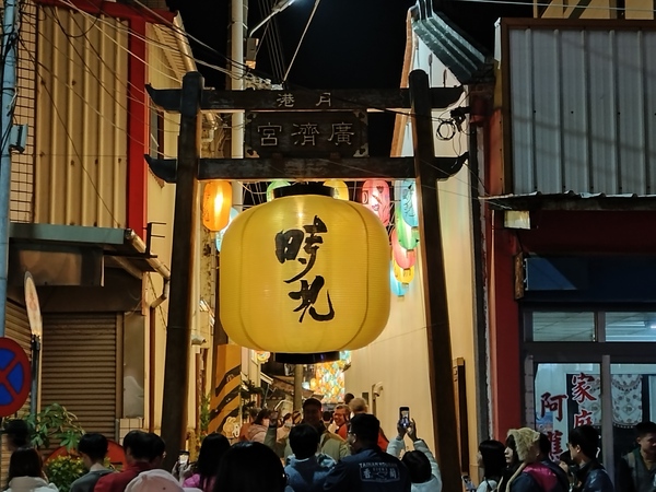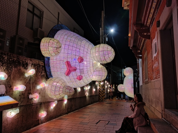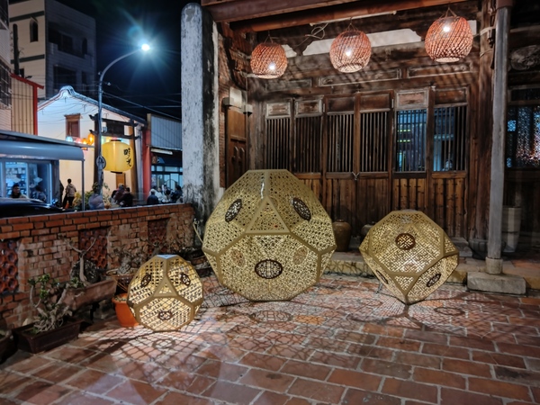 王爺廟巷張燈結綵,吊掛的燈籠使廣濟宮守護的「境」變得光明,高懸於中山路口的木製牌樓,一盞巨大的黃色燈籠書寫「時光」二字,光陰流轉一如燈籠底下的川流人潮;夜色中,八角樓華燈璀璨,門前的花燈《C5熒熒微光》靈感源自東漢詩人秦嘉《贈婦詩》:「飄飄帷帳,熒熒華燭。」融入八角樓木質窗花的元素,透出典雅的質感。