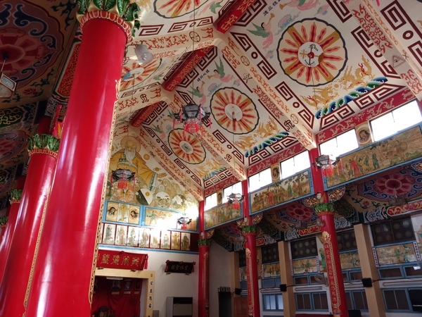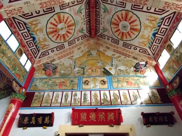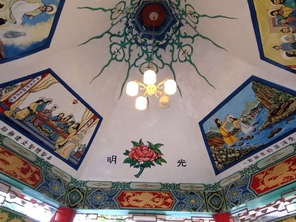 面朝西方的牆面,彩繪《創世紀》(Genesis)第一、二章「開天闢地」的故事。十四幅苦路圖陳列在兩側赤色圓柱之間的採光窗下方,至於採光窗之間描繪中華諸聖,例如:孔子、老子、明朝思想家徐光啟、泰西儒士利瑪竇(Matteo Ricci),以及曾經向原住民傳教的麥傑神父。遊覽其中,不禁引人遐思:究竟神父會藉由什麼樣的東方語彙,述說西方的教義?