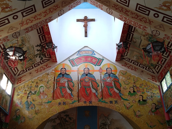 以一座中國宮廷式建築為主體,祭天殿室內排列的赤色圓柱書寫詩詞,天花板則是象徵「天主十誡」與「信望愛德」等主題的圖騰,每個圖騰裝飾雙龍搶珠;面朝東方,祭壇背後圓拱型壁龕上彩繪「最後的晚餐」(Il Cenacolo),畫中人物呈現華人面孔、身著漢服,觥籌交錯,使用筷子享用包子和饅頭,相對於十二門徒的惴惴不安,耶穌神色自若;「最後的晚餐」上方為三位一體(Trinity),代表聖父、聖子、聖靈三個不同的位格,兩側人物則是歷朝歷代跟隨上帝的信眾。